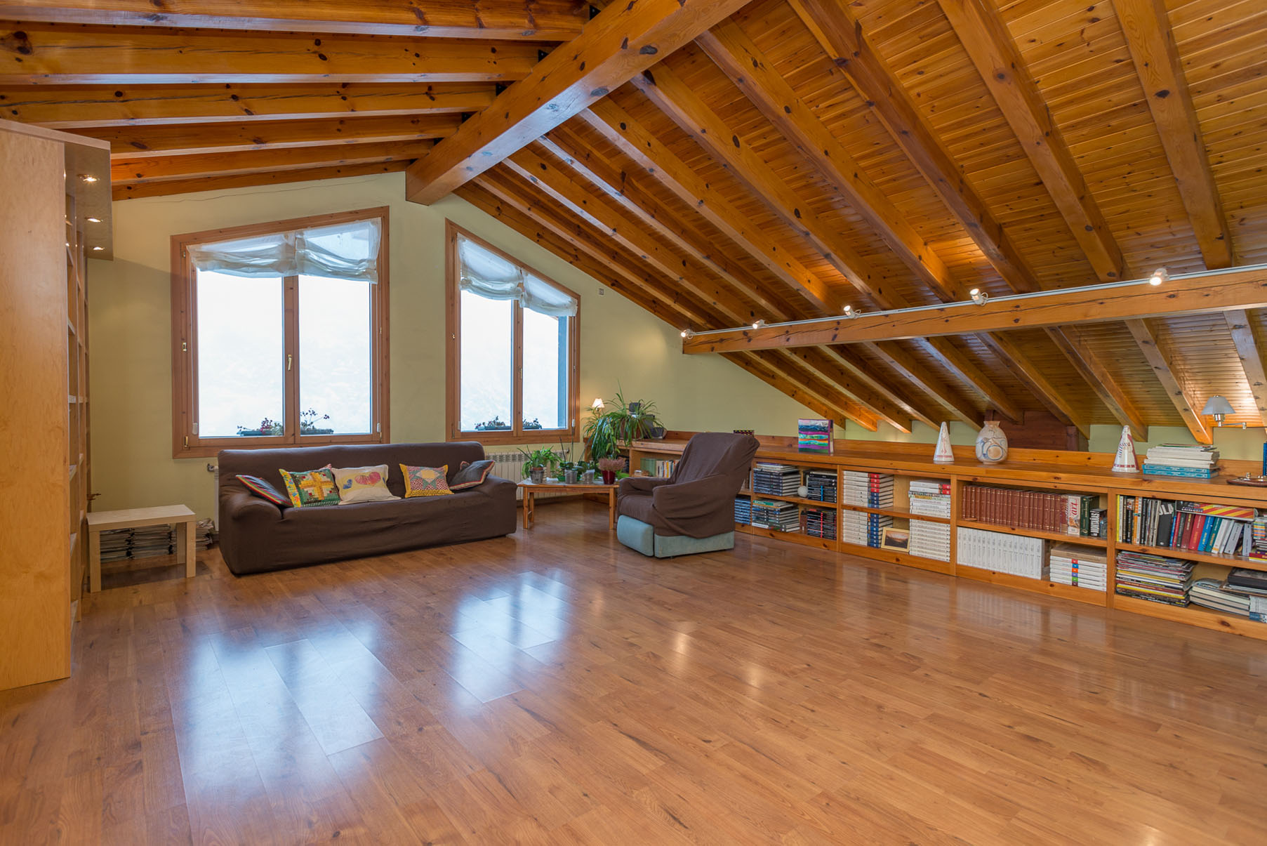 L’última planta, amb estructura sota teulada de fusta i sostres alts, dóna al menjador, cosa que fa que l’estança sigui diàfana i molt agradable.